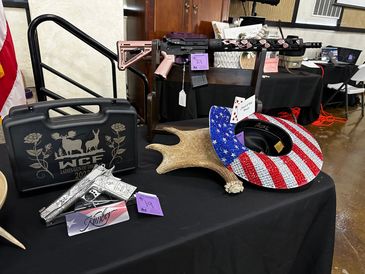 Rock Star Table is $1,000.00 and includes 8 seats, 8 Prime Rib and Shrimp dinners, $500.00 in Ladies General Raffle Tickets and a G Force Bronze Cerakote Flag Shotgun!